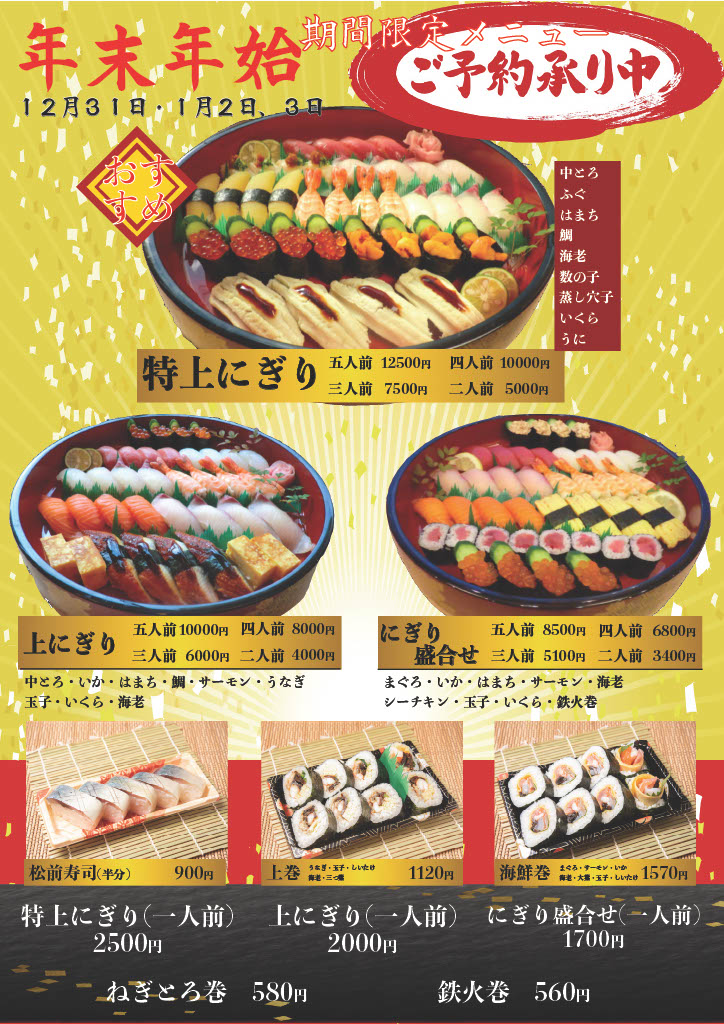 🎍年末年始のお持ち帰りご予約受付中🎍ぼて六甲店(神戸市灘区)【12/31・1/2・1/3】の3日間だけの✨期間限定メニュー✨です。|回転寿司「ぼて」六甲店