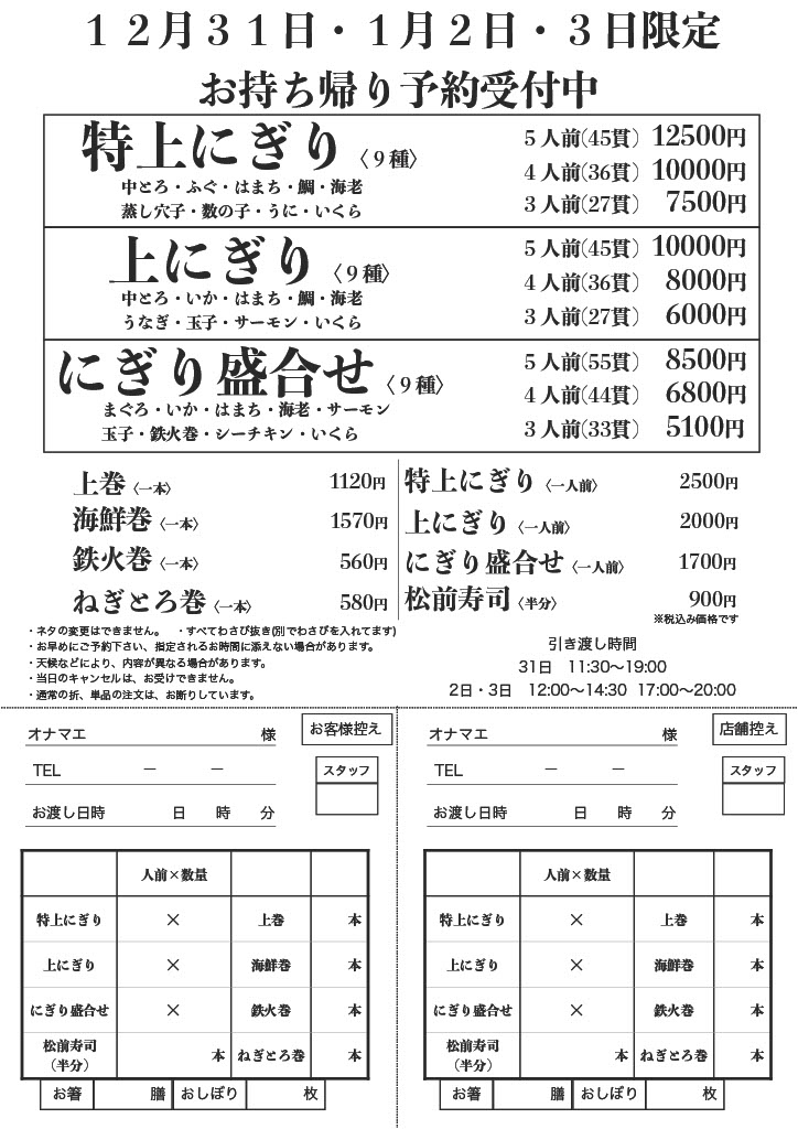 【本格回転寿司ぼて六甲店】年末年始のお持ち帰り寿司の予約受付中です!!(ご予約表の印刷できます)|回転寿司「ぼて」六甲店