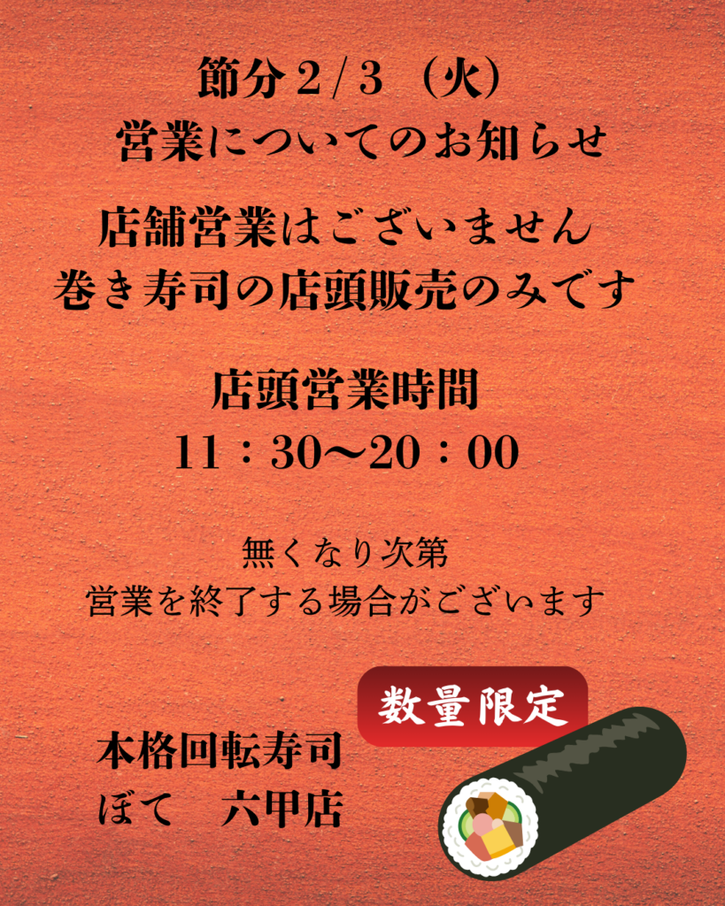 【本格回転寿司ぼて六甲店】節分の営業についてのお知らせ